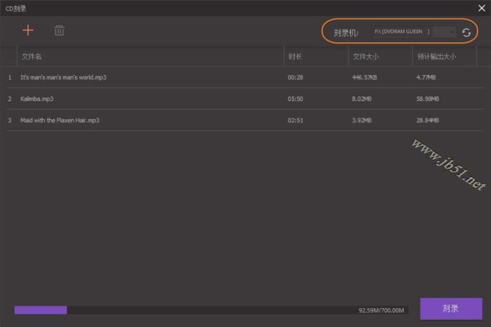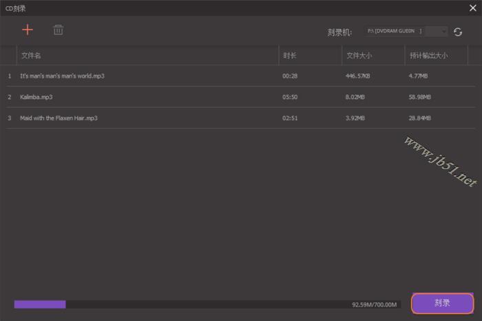 所有已添加的音頻文件將會顯示該文件名、時長、文件大小以及 預計輸出大學,您可以雙擊播放音樂。您也可以刪除或添加更多文件,只需點擊左上角的圖標即可。當您已選所有文件,將一個空白的CD光碟放入電腦并選擇右上角的刻錄機。