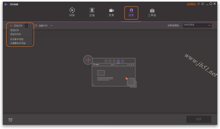 開啟萬興優轉后在主界面上方切換至刻錄標簽頁,您將會看到以下的界面。在這里您有三種方法導入視頻。