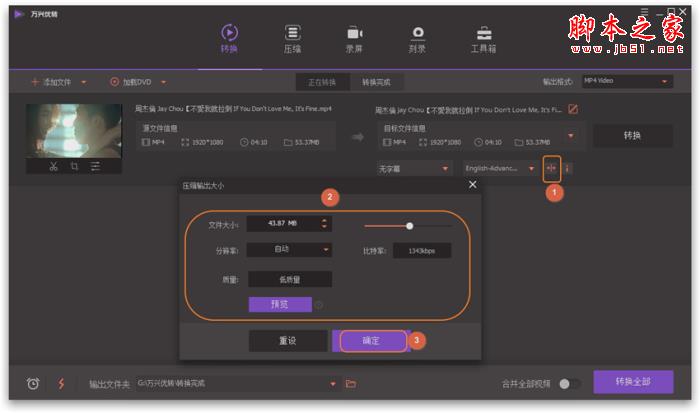 圖標即可一個個將視頻壓縮。一個新的設置窗口將會打開,您可以在這里設置文件大小、分辨率、質量和比特率。點擊預覽按鈕即可查看視頻壓縮后的前20秒效果。最后,點擊確認按鈕保存視頻壓縮設置。