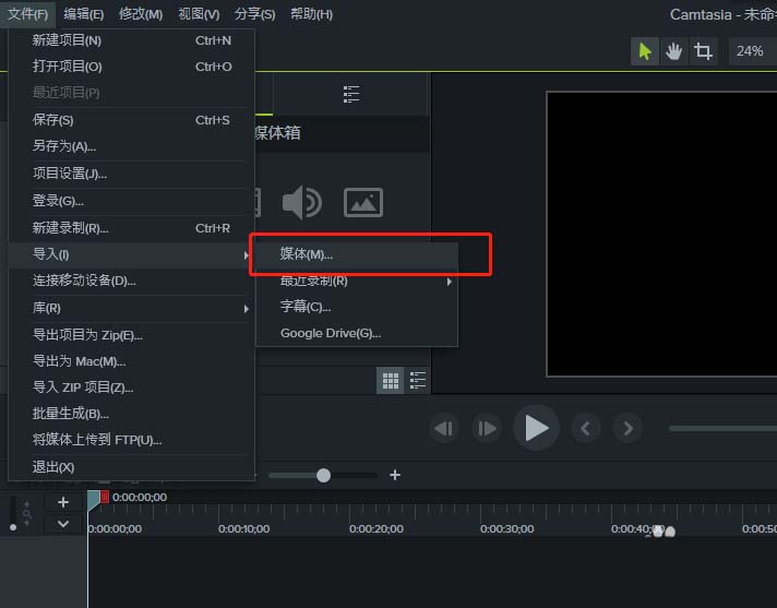 1、創建一個空Camtasia 9項目,選擇執行文件菜單的導入,執行導入媒體。