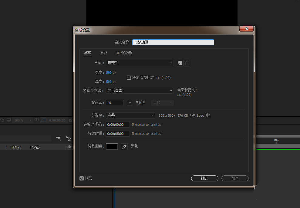 1、打開AE軟件,新建合成,命名勾勒動(dòng)畫,調(diào)整相應(yīng)的參數(shù)