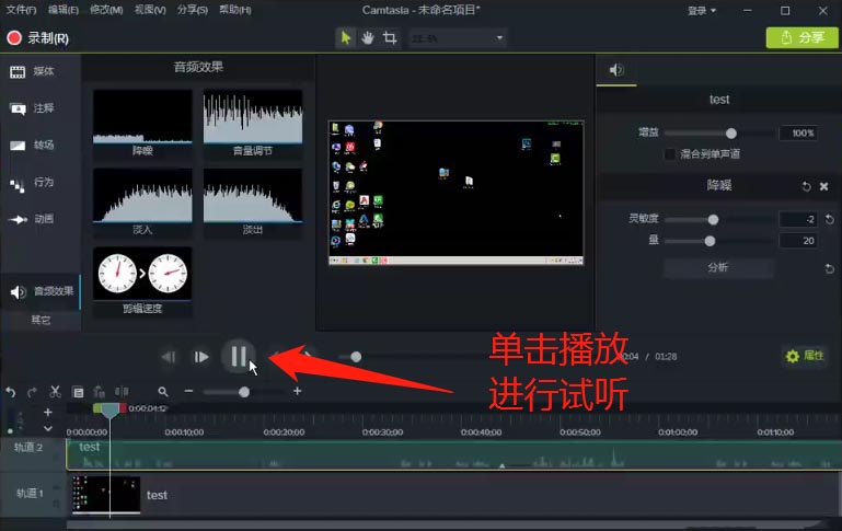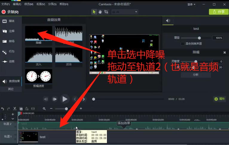 8、單擊選中降噪,并拖動至軌道2上(也就是音頻軌道)。