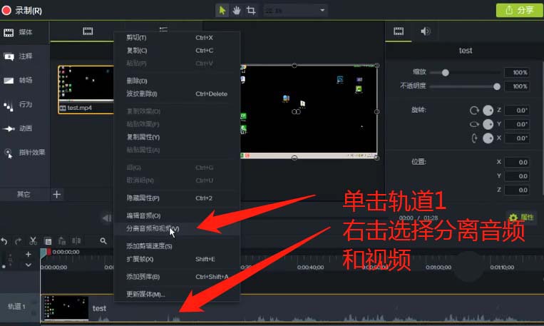 6、單擊軌道1,右擊,單擊【分離音頻和視頻】