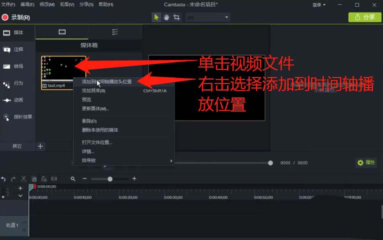 5、單擊視頻文件,右擊選擇【添加到時間軸播放位置】