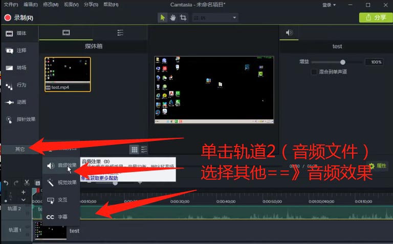 7、單擊軌道2(也就是音頻軌道),選擇【其他】==》【音頻效果】