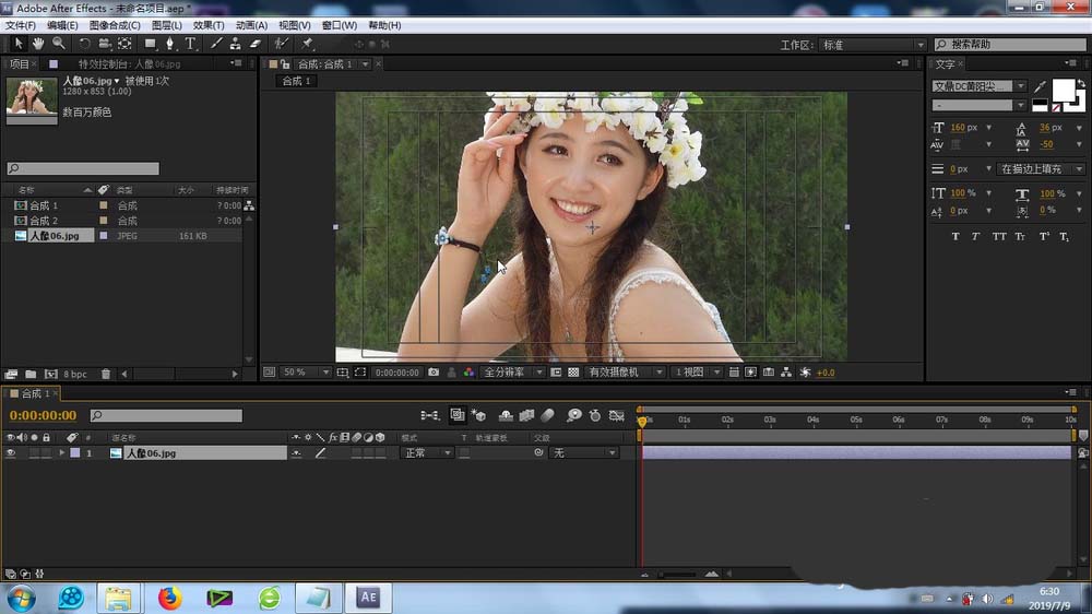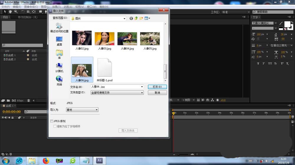 1、首先就是素材的導入,這個導入的方法很簡單,不再贅述,將素材庫的素材拉至合成里面的時間線上