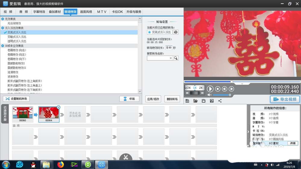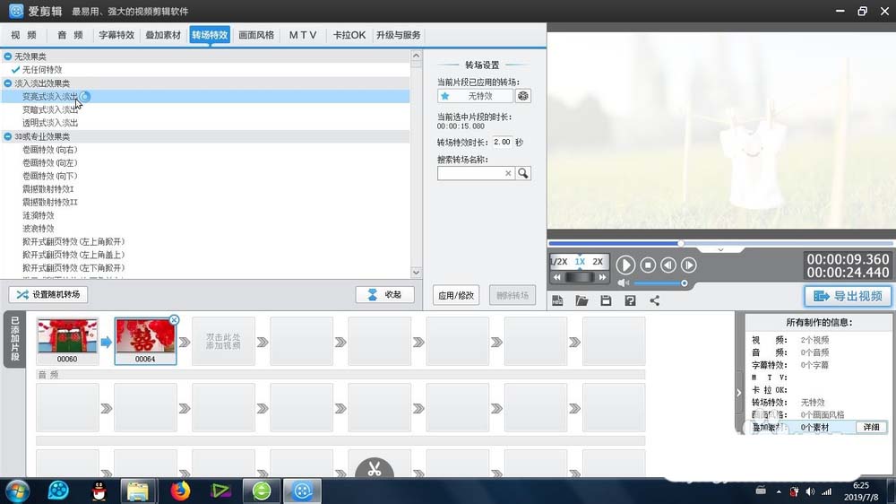 1、首先這個(gè)變亮式淡入淡出效果 -是在愛剪輯里面的轉(zhuǎn)場(chǎng)特效-淡入淡出效果類-里面可以找到在時(shí)間線上進(jìn)行兩端視頻的選擇添加