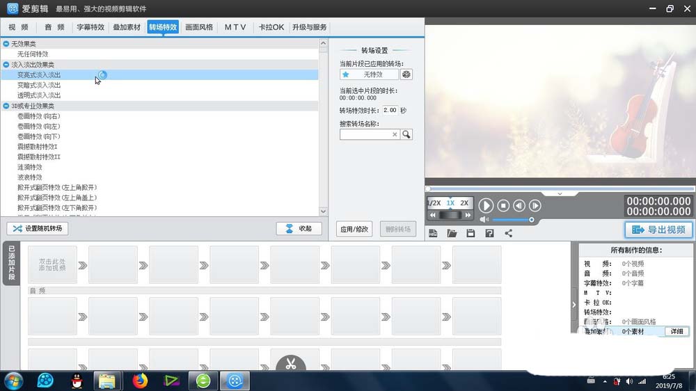 4、在軟件的上方工具欄里面,預(yù)覽我們剛才找到的:轉(zhuǎn)場(chǎng)特效-淡入淡出效果類