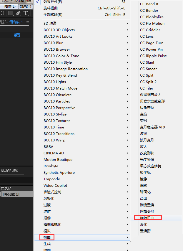 5、選中預合成,添加旋轉扭曲效果;效果-扭曲-旋轉扭曲;