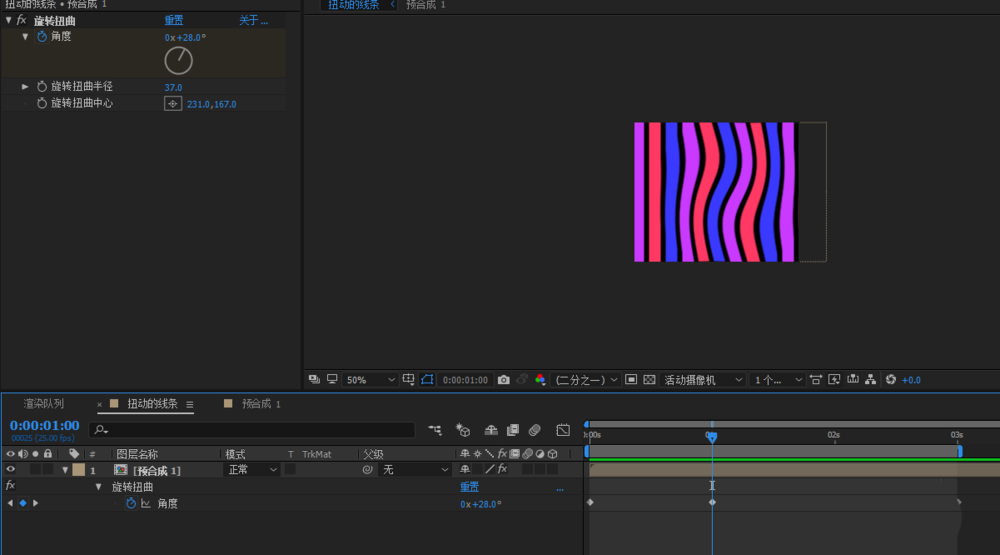 6、調整角度值可以調整扭曲的程度;半徑可以控制扭曲的范圍;中心點能控制扭曲的位置;我們通過給角度K關鍵幀實現線條扭曲動畫;
