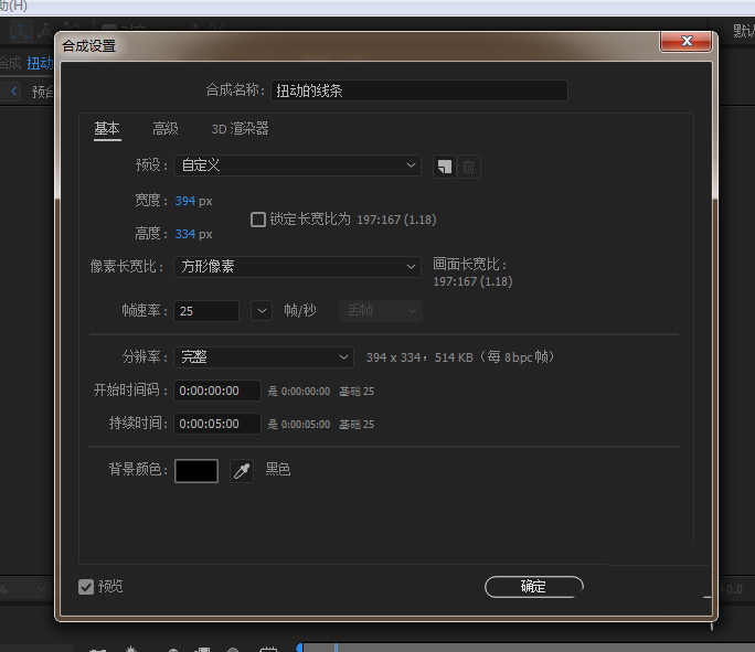 1、打開AE軟件,新建合成,命名扭動的線條,調整相應的參數。