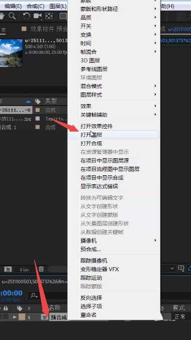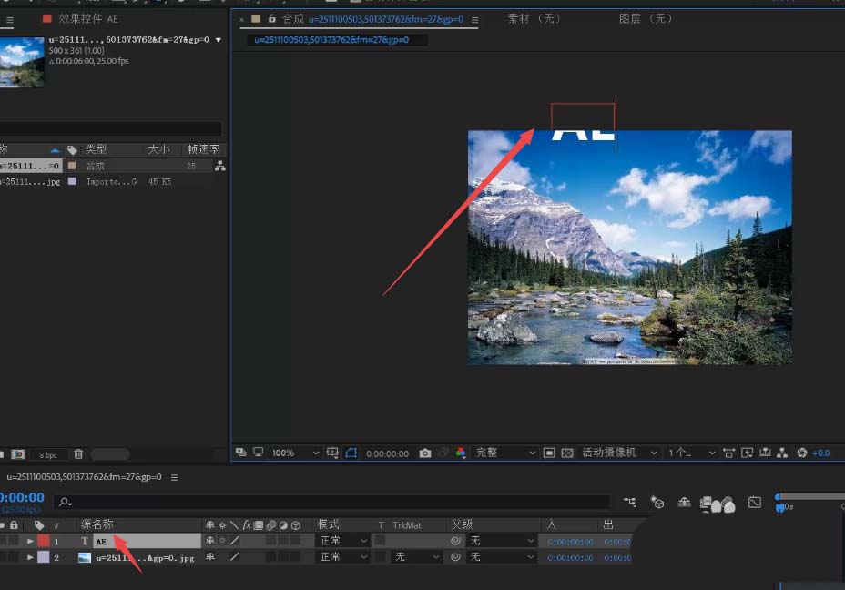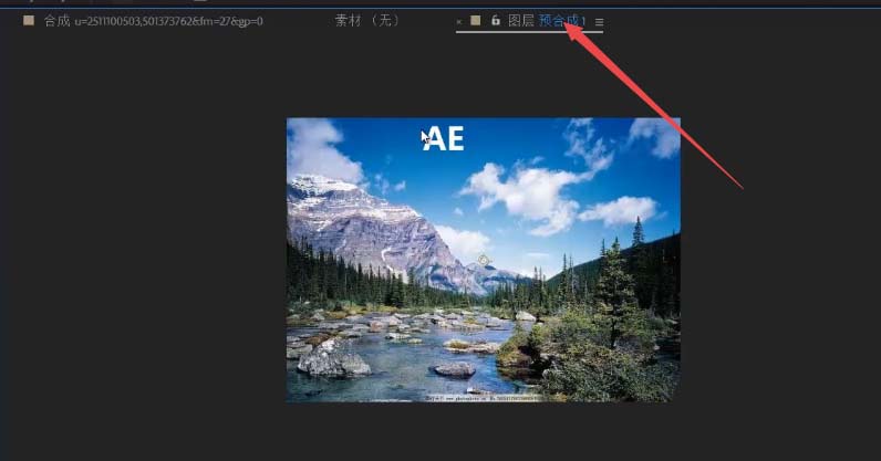 5、那現(xiàn)在這個ae就成了水印了,那現(xiàn)在這個文字沒有打印在樹上上面,它周圍是空的,像這種情況,我們可以把鼠標(biāo)移到預(yù)合成,點擊右鍵,點擊進(jìn)入圖層