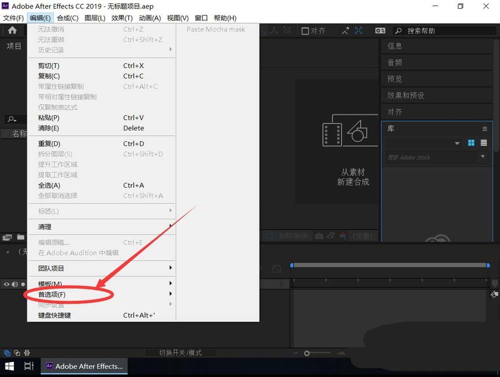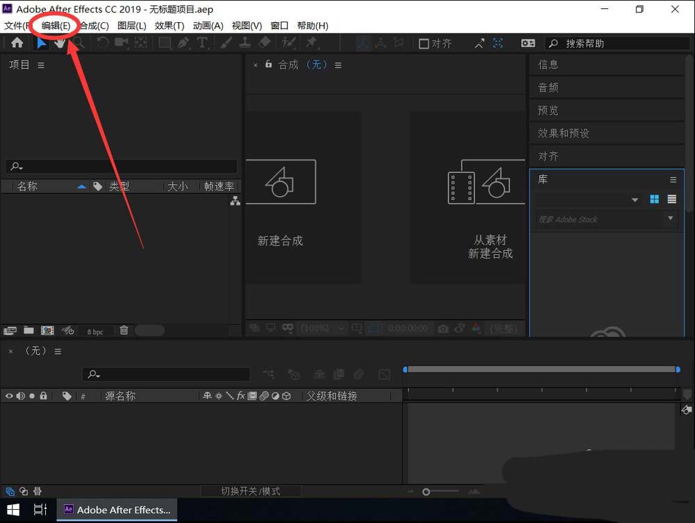 3、打開AE后點擊軟件工具欄上的“編輯”選項