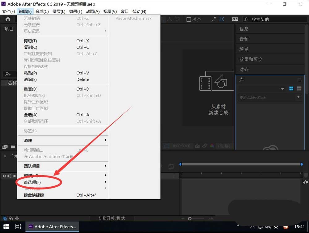 3、打開AE 2019后,點擊軟件頂部工具欄上的“編輯”