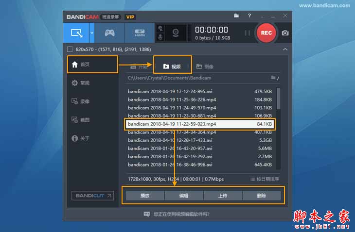 3. 在 Bandicam [ 首頁 ] > [ 視頻 ] 點擊完整視頻或截圖,即可播放此視頻,也可以直接上傳到 YouTube/Vimeo等。