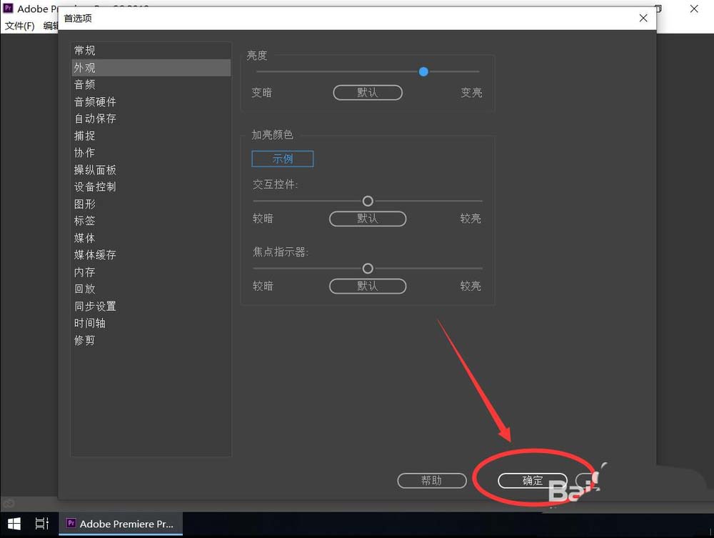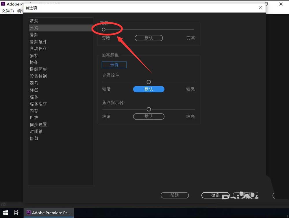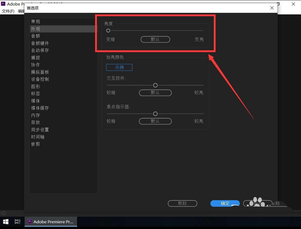 6、打開外觀設置后,在亮度一欄中,可以選擇Pr外觀顏色明暗,默認是最暗