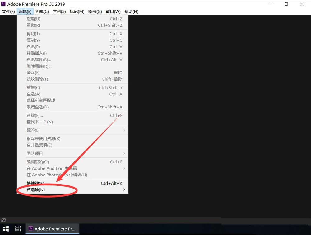 3、打開Pr后,點擊軟件頂部工具欄上的“編輯”