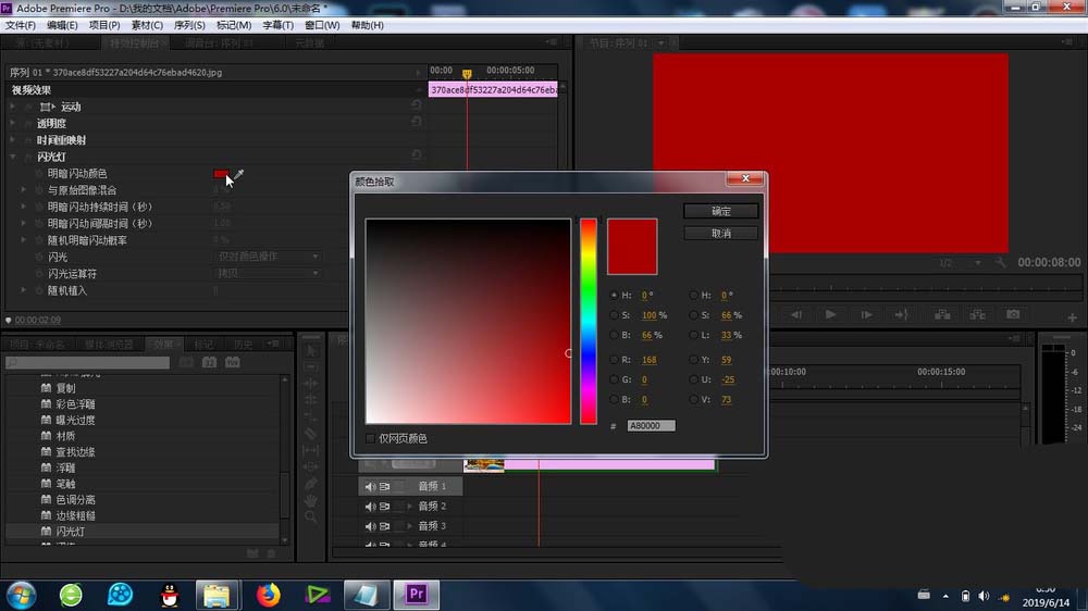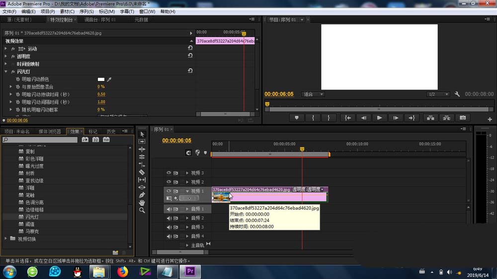 4、接下來就是關鍵的效果添加,拖動“閃光燈”效果到素材上即可