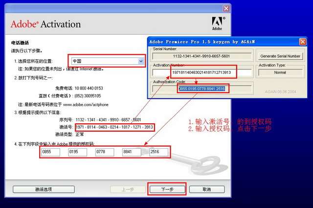 首先在所在的位置里面選擇“中國”。然后把激活號輸入到注冊機里面會自動生成授權碼。最后輸入授權碼點擊“下一步”如圖10。