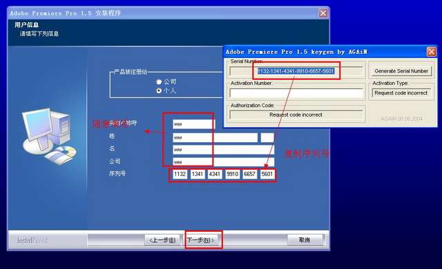 這里的個人信息自己隨意填寫即可。把注冊機里面的序列號輸入到我們的安裝程序里面,然后點擊“下一步”如圖7。