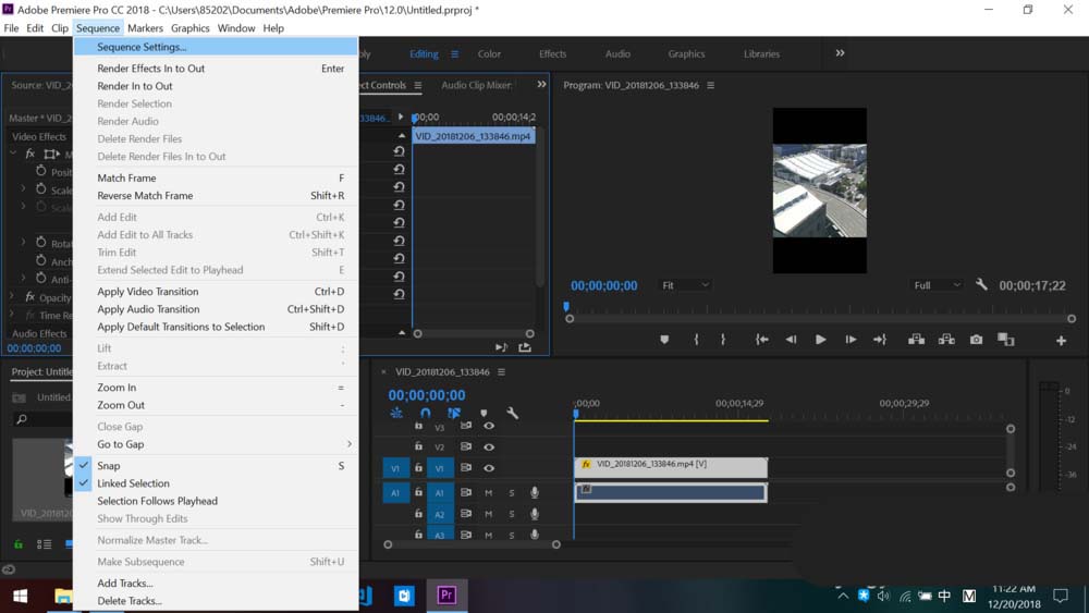 6、旋轉(zhuǎn)后發(fā)現(xiàn)我們的視頻留有上下黑邊,這時我們需要再編輯一下序列幀的大小,以去除黑邊。首先打開圖示序列設(shè)置菜單