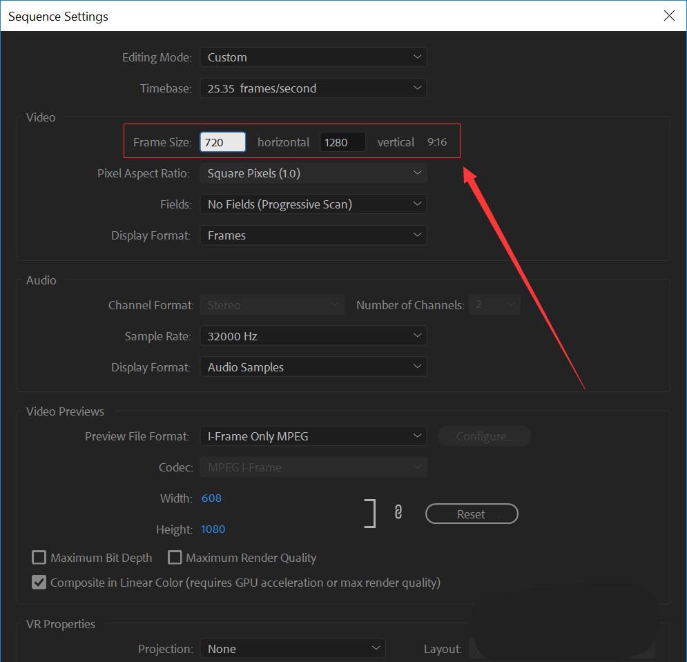 7、在序列設(shè)置菜單中,將幀大小文本框中的水平和垂直數(shù)值交換一下,例如720*1280的原數(shù)值視頻旋轉(zhuǎn)后就應(yīng)該為1280*720
