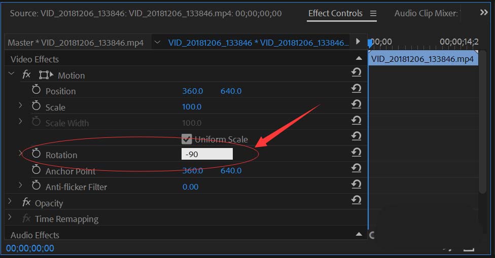 5、在效果控制頁面中,選中旋轉(zhuǎn)的編輯框,輸入-90,即為將視頻逆時針旋轉(zhuǎn)90度