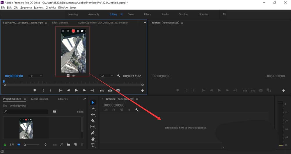 3、接著,我們將導(dǎo)入的視頻從源文件框拖拽到時間軸框,如下圖所示。視頻加入時間軸方框后方可編輯