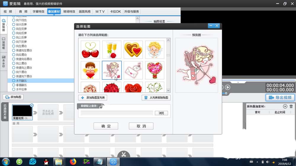 3、選擇合適的貼圖,確定之后,貼圖就會出現(xiàn)在視頻預(yù)覽區(qū)域