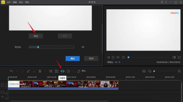 單擊視頻軌道上的視頻,點擊工具欄中的【馬賽克】按鈕,彈出方框,點擊【添加】,視頻界面會出現一個淺黃色矩形,