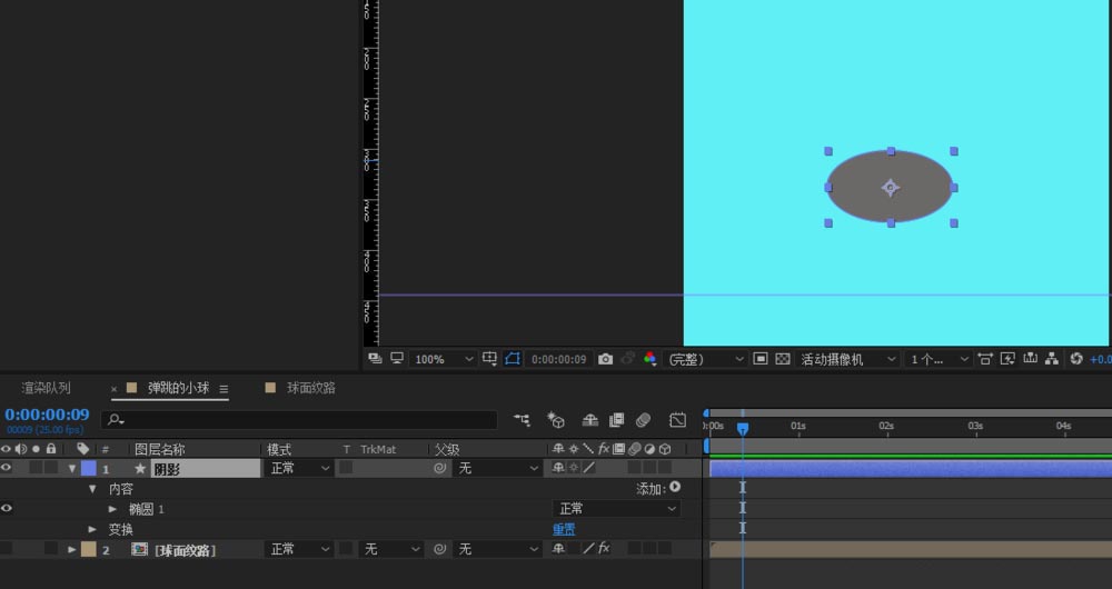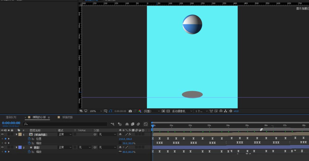 3、給陰影的縮放K關鍵幀,實現球掉落靠近的時候影子變大,離開時影子變小,一次類推;選中所有關鍵幀,按下f9鍵來一個緩動的效果;
