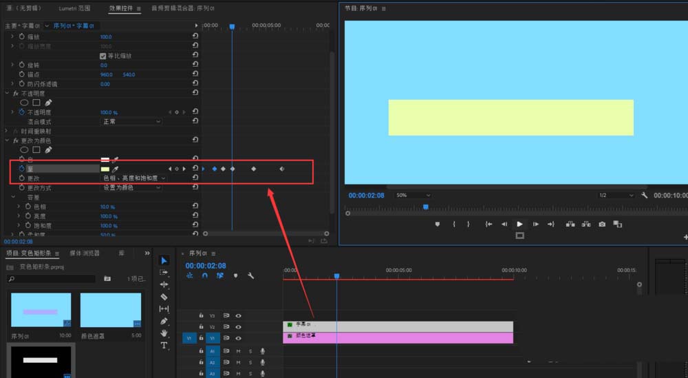 6、選中矩形條,在效果控件中找到更改為顏色命令,將更改選擇色相,亮度和飽和度,然后設置至的關鍵幀動畫,沒移動一段時間更改顏色并創建關鍵幀。最后播放時間軸一個表色的矩形條動畫就完成了。