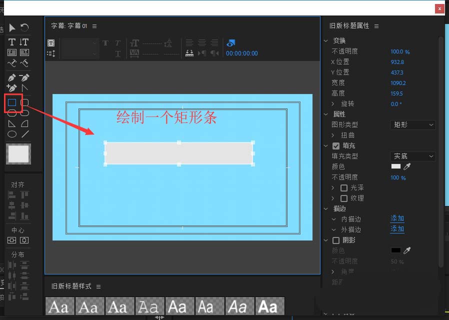 3、在彈出的舊版標題窗口中,選擇矩形工具,用矩形工具在畫面的合適位置中繪制一個矩形條出來。