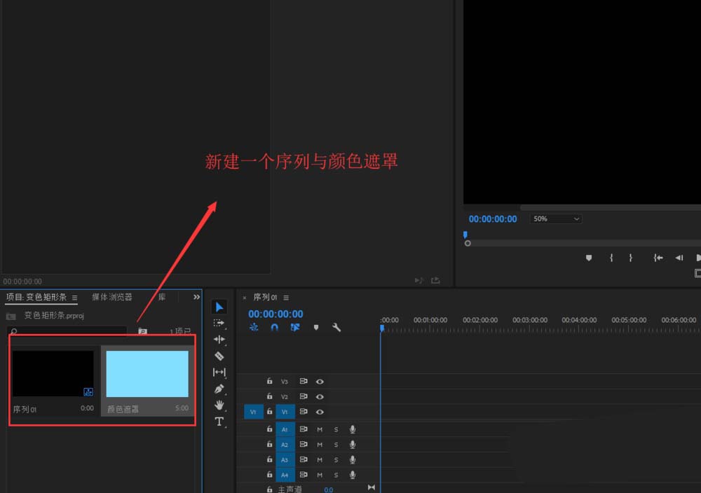 1、打開Premiere軟件新建一個剪輯項目,然后創建序列并新建一個顏色遮罩出來。