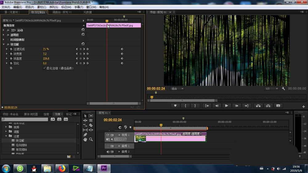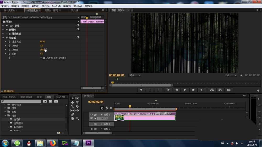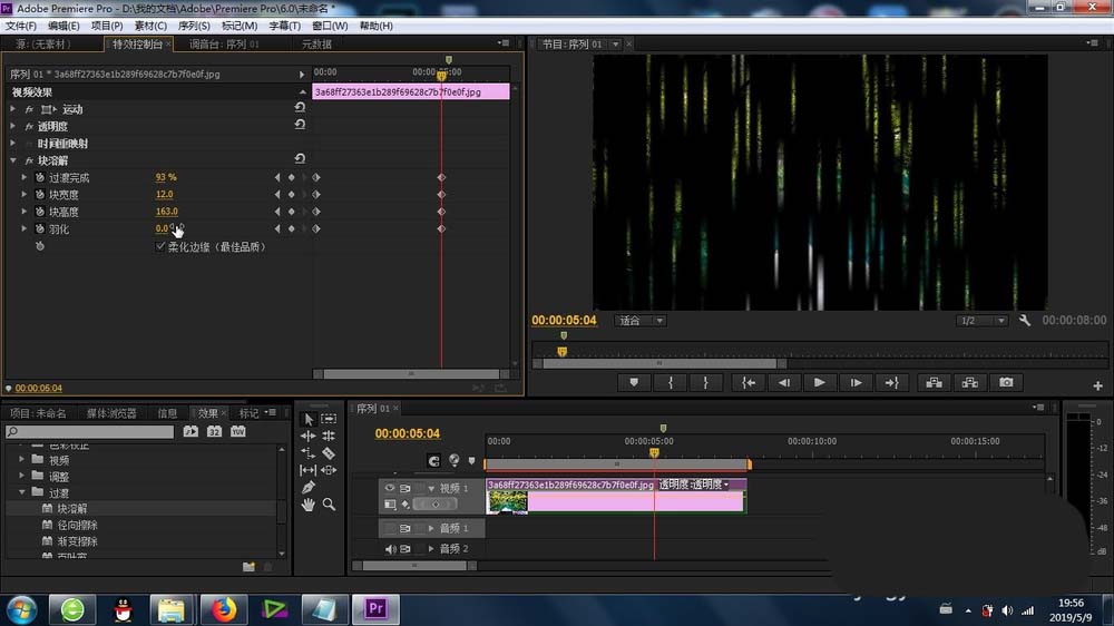 4、將“塊溶解”的功能拖拽到素材上面,形成默認(rèn)的塊溶解效果