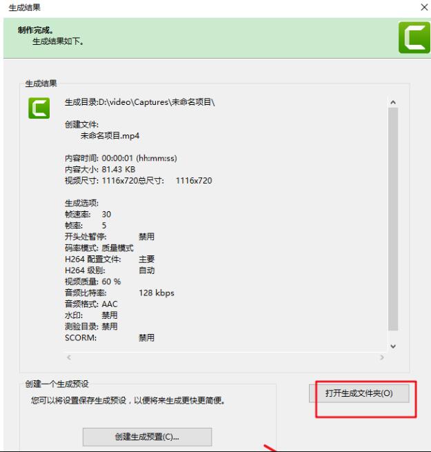 等待視頻生成,會(huì)有相關(guān)提示,點(diǎn)擊【打開生成文件夾】選項(xiàng),可以找到剛才生成的視頻。