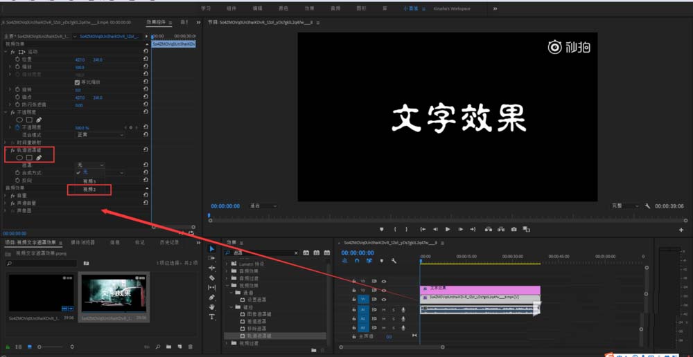 5、然后調出效果控件面板,將遮罩選擇視頻1 文字圖層(根據自己實際情況來)