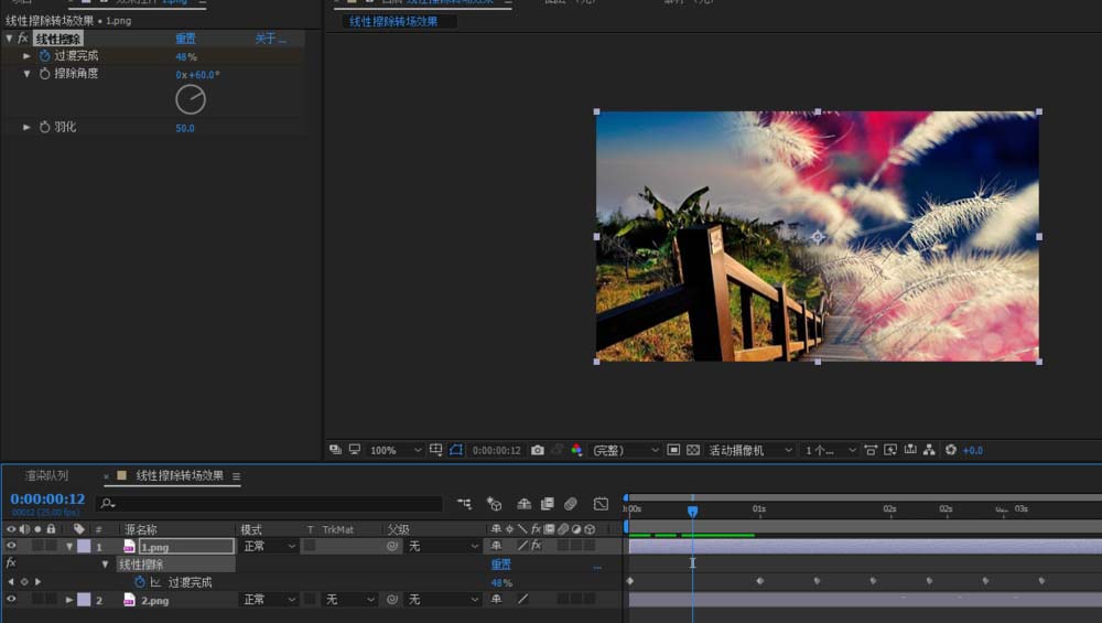 5、我們可以通過K過渡完成值來實現一個轉場的效果,開始時過渡完成值為0,結束為100%。適當調整擦除角度和調節羽化值。