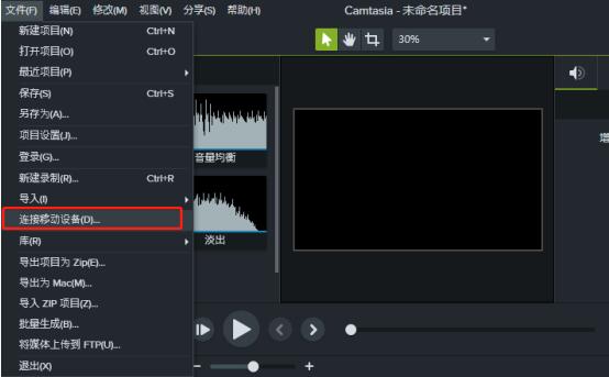 打開Camtasia Studio軟件,進入界面,點擊菜單欄中的【文件】——【連接移動設備】,如圖,