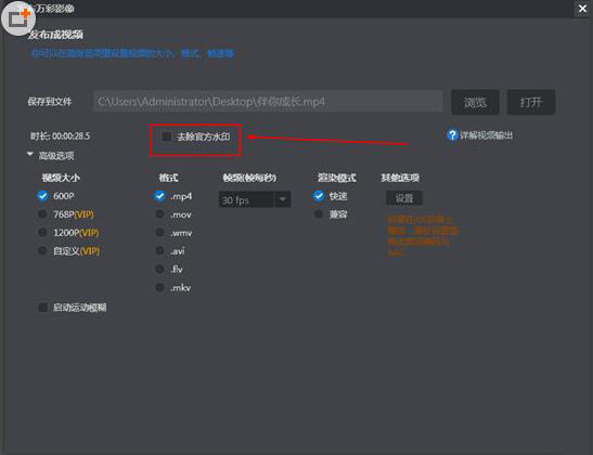 4、在發布前,選擇發布作品的各個選項,包括輸出格式與視頻大小等選項,接著將“去除官方水印”的選項進行勾選,這樣導出的影像文件將不會出現萬彩影像大師官方所帶的水印了,如下圖所示: