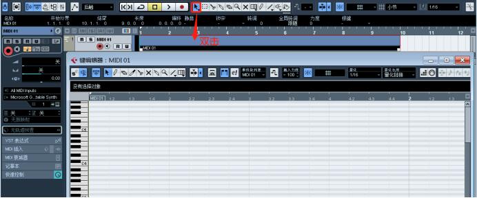 然后選擇箭頭工具,在MIDI塊上雙擊鼠標,即可進入鋼琴卷簾窗,
