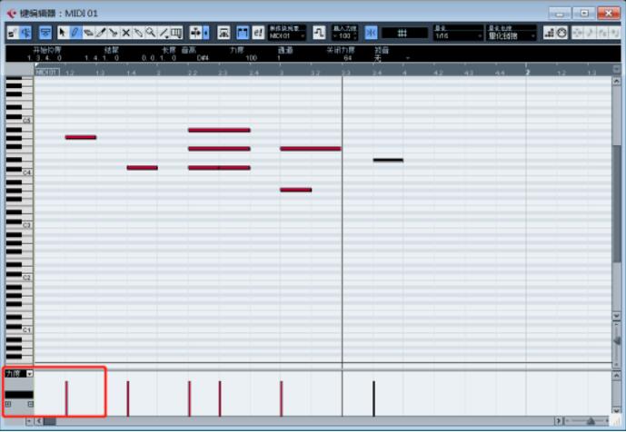 寫好音符之后,找到鋼琴卷簾窗下面【力度】豎條,可以調整對應上方的音符力度大小,注意,力度不是音量。