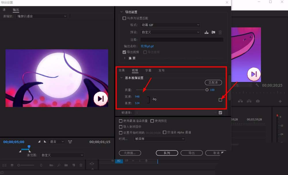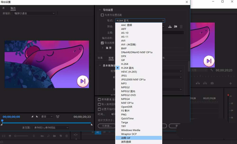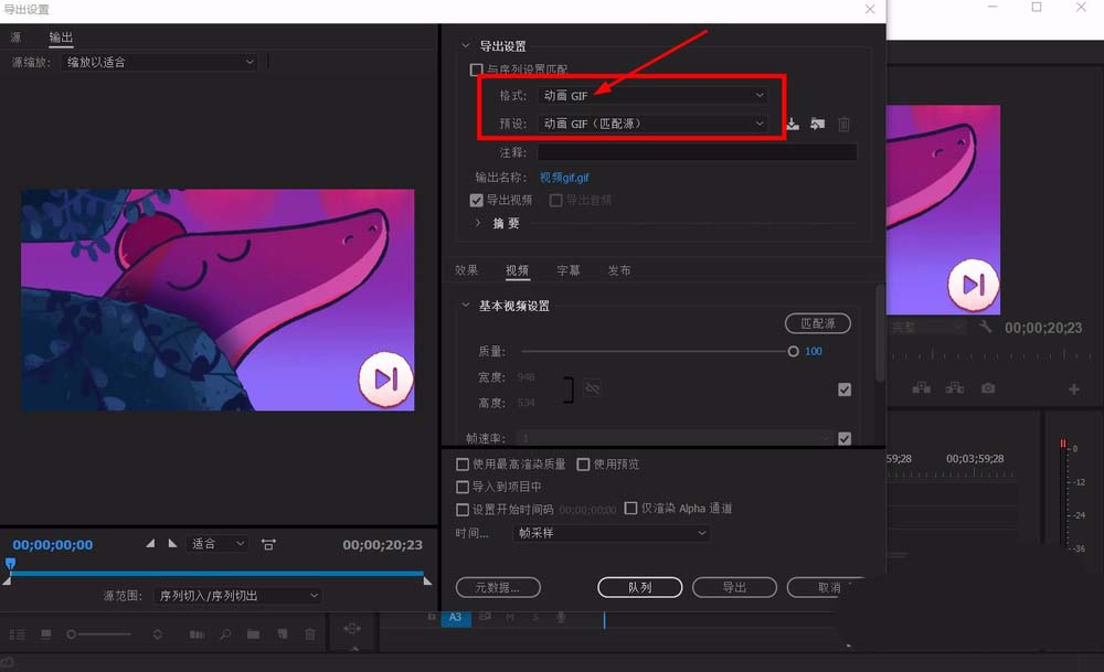 5、格式設置為GIF后,預設選項會默認設置為——動畫GIF匹配源,這樣GIF的文件分辨率大小就會和原視頻相同,GIF文件會較大。