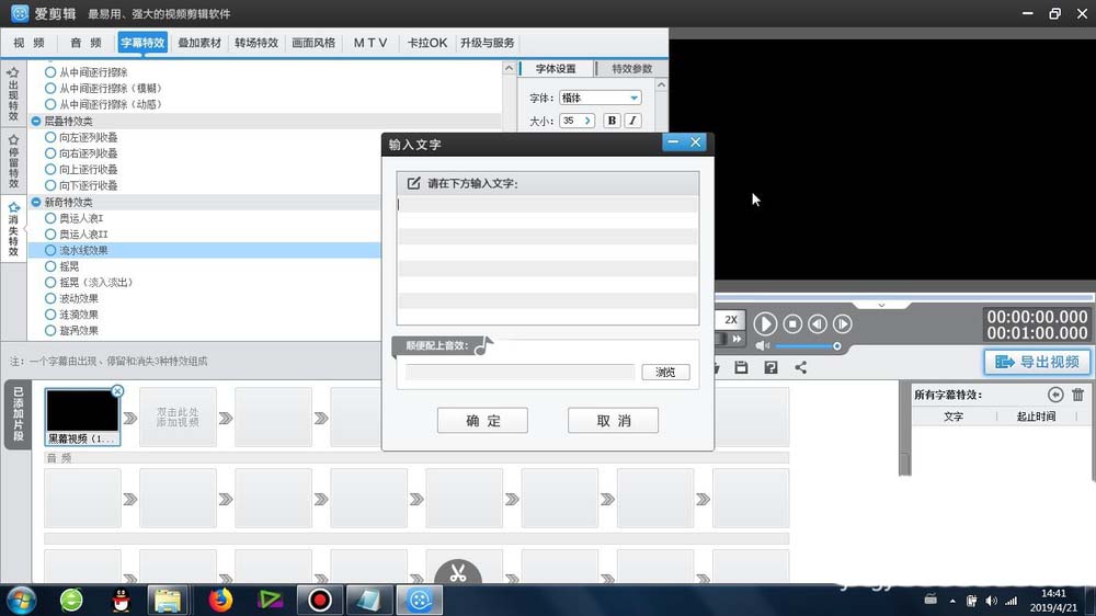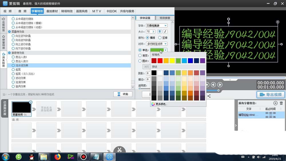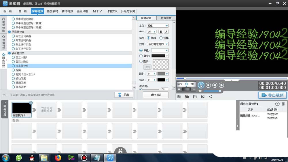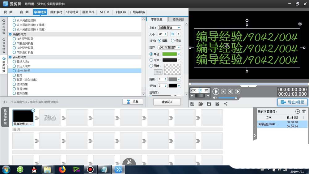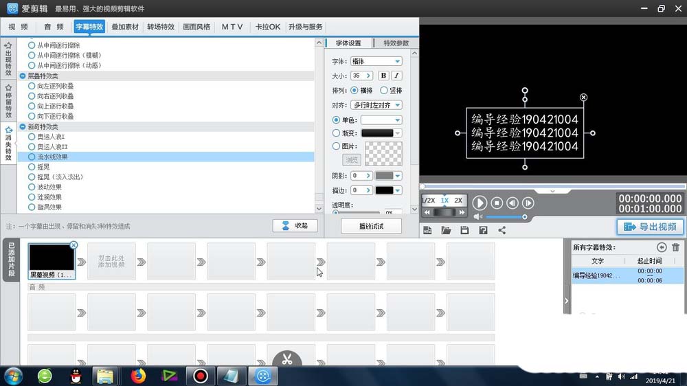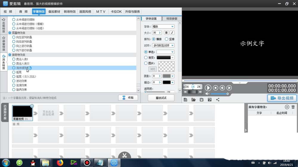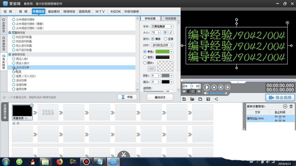 1、這個(gè)流水線效果的存在位置是:字幕特效-消失特效-新奇特效類,一定要找到