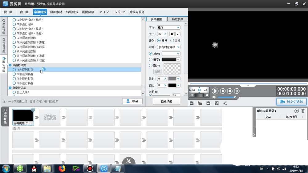 5、在保證字幕被選擇的情況下,可以勾選左側(cè)的- 向左逐列收疊效果 ,形成文字效果