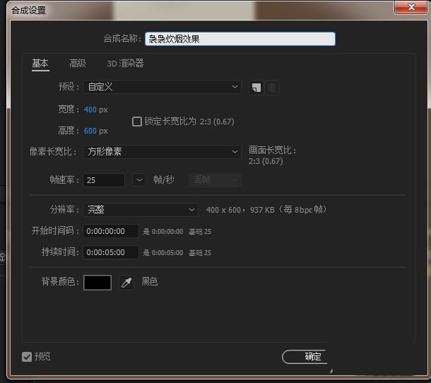 1、打開AE軟件,命名裊裊炊煙,調整相應的參數。