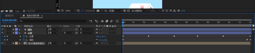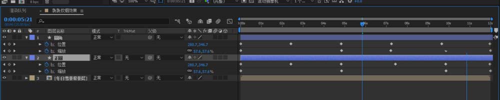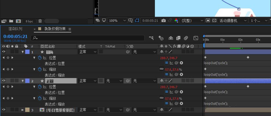 8、分別點擊兩個圖層的位置和縮放屬性前面的小秒表,給他們添加循環表達式loopOut('cycle');
