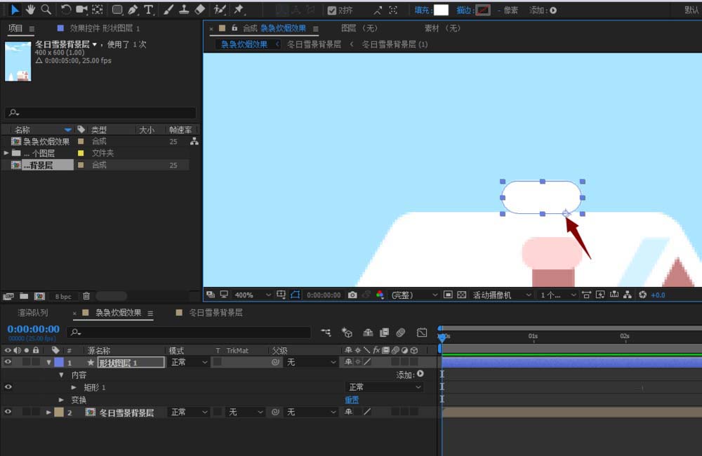 5、選中圓角矩形,按下P位置屬性,給圓角矩形的位置K關鍵幀,實現圓角矩形慢慢的左右擺動往上飄。