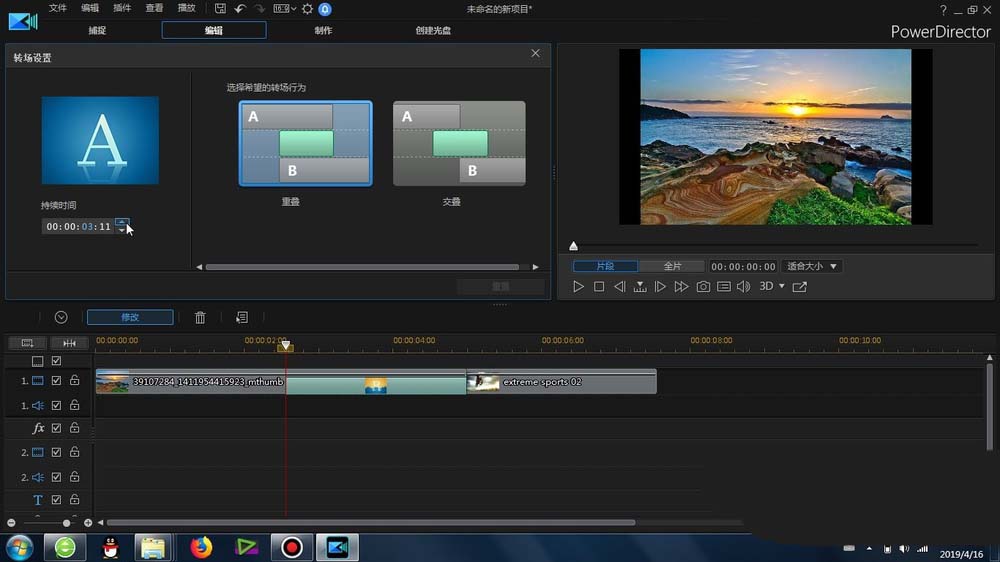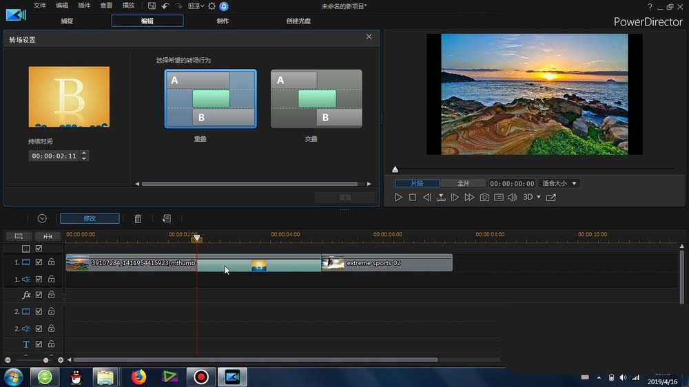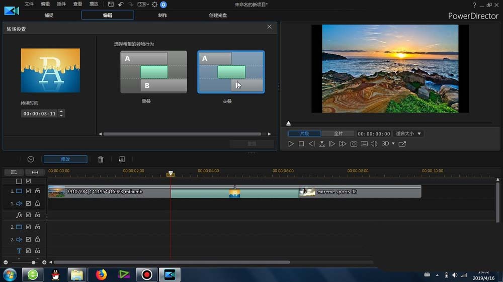 5、雙擊這個轉場標識,可以打開其設置窗口,可以設置它的特效持續時間、轉場的行為以及轉場的方向
