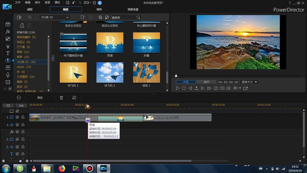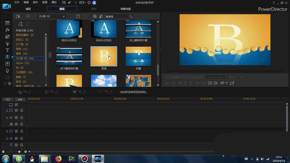 1、這里的“雨滴效果”轉場是在威力導演里面的-轉場-常規-里面可以找到